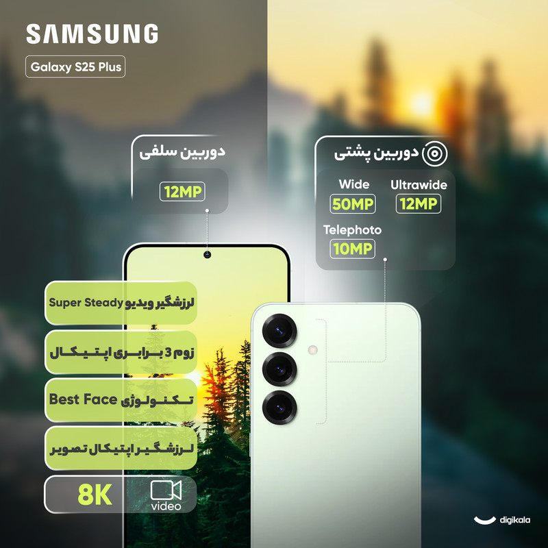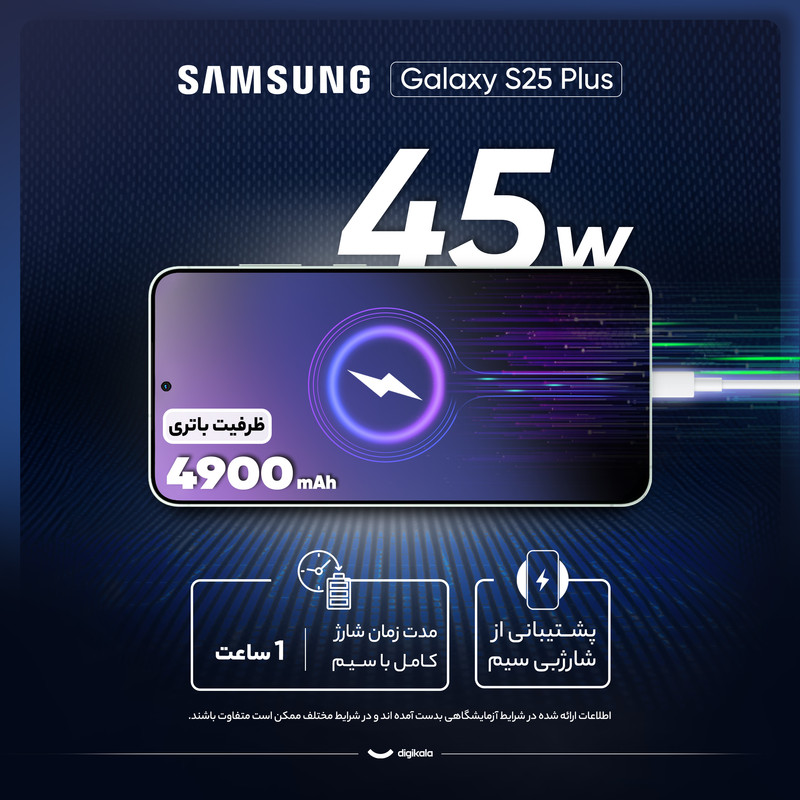 سامسونگ گلکسی S25 پلاس یکی از برجستهترین و پیشرفتهترین پرچمداران این برند است که در سال 2025 معرفی شد. این گوشی با طراحی زیبا و بدنهای مقاوم از جنس شیشه و فریم آلومینیومی، علاوه بر جذابیت ظاهری، استاندارد IP68 را برای مقاومت در برابر آب و گرد و غبار به ارمغان میآورد. ضخامت دستگاه تنها 7.3 میلیمتر و وزن آن 190 گرم است که احساس راحتی و سبکی در دست را به کاربر منتقل میکند. نمایشگر 6.7 اینچی Dynamic LTPO AMOLED 2X با رزولوشن 1440 در 3120 پیکسل، تجربهای بینظیر از کیفیت تصویر را ارائه میدهد. نرخ تازهسازی 120 هرتز، منجر به پیمایش نرم و اجرای روان بازیها و برنامهها میشود. با حداکثر روشنایی 2600 نیت، استفاده از گوشی در محیطهای پرنور به راحتی امکانپذیر است و پشتیبانی از HDR10+ رنگها را به شکل طبیعی و زنده به نمایش میگذارد. عملکرد این گوشی به لطف پردازنده قدرتمند Qualcomm Snapdragon 8 Elite به اوج خود رسیده است. با 12 گیگابایت رم و گزینههای حافظه داخلی 256 یا 512 گیگابایتی، اجرای هر نوع بازی یا برنامه سنگین به سادگی صورت میگیرد. هرچند این موبایل از شیار کارت حافظه پشتیبانی نمیکند، فضای ذخیرهسازی داخلی در نظر گرفته شده آن برای اغلب کاربران کافی است. سیستم دوربین این گوشی شامل یک سنسور اصلی 50 مگاپیکسلی، یک دوربین تلهفوتو 10 مگاپیکسلی با زوم اپتیکال 3 برابری و یک لنز اولتراواید 12 مگاپیکسلی است که این ترکیب به عکاسی با کیفیت در شرایط نوری مختلف کمک میکند. دوربین سلفی 12 مگاپیکسلی نیز با پشتیبانی از HDR10+ تصاویر شفاف و واقعی را به نمایش میگذارد. باتری 4900 میلیآمپرساعتی با پشتیبانی از فناوری شارژ سریع 45 وات، شارژ بیسیم 15 وات و شارژ معکوس 4.5 وات، کاربران را در طول روز همراهی میکند. علاوه بر این، سیستمعامل اندروید 15 به همراه رابط کاربری One UI 7 تجربهای نرمافزاری بهینه و روان را برای کاربران فراهم میآورد. سامسونگ همچنین تضمین کرده که این گوشی تا هفت نسخه اصلی اندروید را دریافت کند که این امر از نظر پشتیبانی نرمافزاری، یک مزیت بزرگ به شمار میآید.