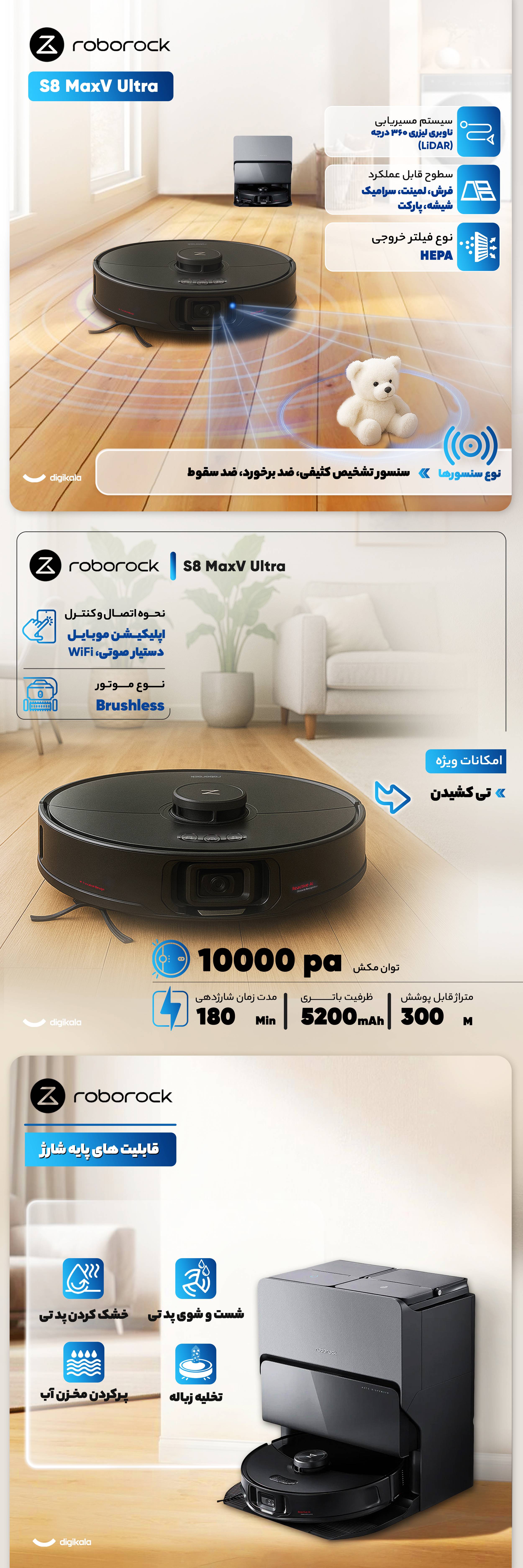 با معرفی جاروی هوشمند Roborock S8 MaxV Ultra، تجربهای جدید از تمیزی و ارتباط با خانهتان را تجربه کنید. این روبات با ویژگیهای پیشرفتهای مانند نقشهبرداری و ناوبری لیزری دقیق، تشخیص واکنشی مانعها، برس/مپ هوشمند، و دستیار صوتی، به شما کمک میکند تا به راحتی و بدون دردسر، خانهتان را تمیز نگه دارید. با قدرت مکش 10000 پاسکال و قابلیت نقشهبرداری چند طبقه، این روبات به شما اجازه میدهد تا حتی در محیطهای پیچیده و چند طبقه، کنترل کاملی بر تمیزی داشته باشید. فیلتر قابل شستشو، خاصیت خود خالی شونده و خود خشک شونده، نگرانیهای شما در مورد تمیزی و بهداشتی بودن هوا در خانه را برطرف میکند. این جارو با ابعاد کوچک و باتری با عمر 180 دقیقه، این روبات به راحتی در فضاهای مختلف جا میشود و به مدت طولانی بدون نیاز به شارژ مداوم، خانهتان را تمیز میکند.