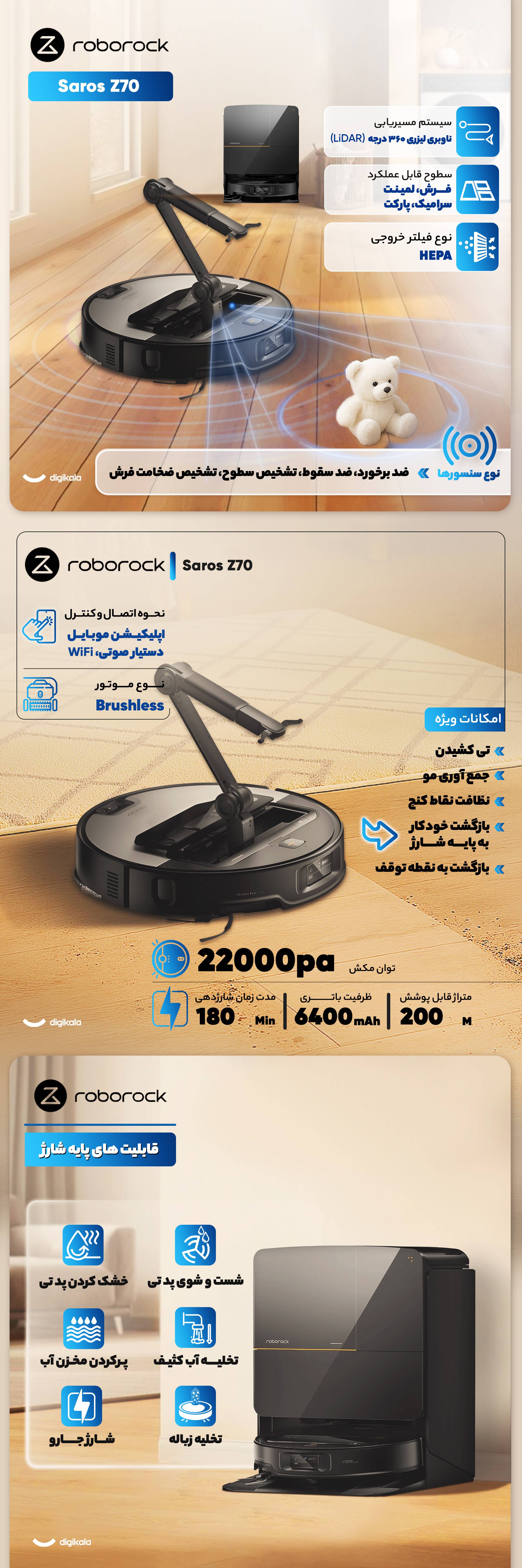 جاروبرقی رباتیک روبوراک مدل Saros Z70 یکی از قدرتمندترین و پیشرفتهترین محصولات این برند است که با طراحی ظریف و وزن ۴.۹ کیلوگرم عرضه میشود. موتور براشلس این دستگاه توان مکشی بینظیر معادل ۲۲۰۰۰ پاسکال ایجاد میکند و در کنار فیلتر خروجی HEPA، حتی کوچکترین ذرات گردوغبار را جذب کرده و محیطی بهداشتی و سالم فراهم میکند. میزان صدای تولیدی تنها ۵۵ دسیبل است که عملکردی آرام و بیصدا را تضمین میکند. باتری قدرتمند ۶۴۰۰ میلیآمپر ساعت با یکبار شارژ، تا ۱۸۰ دقیقه شارژدهی ارائه میدهد و قادر است فضایی در حدود ۲۰۰ مترمربع را بهطور کامل پوشش دهد. ایستگاه Dock 4.0 بهعنوان یک پایه چندکاره، امکاناتی همچون شارژ خودکار، شستوشو و خشککردن پد تی، پر کردن مخزن آب، تخلیه آب کثیف و جمعآوری زباله را در اختیار کاربر قرار میدهد. مخزن زباله داخلی با ظرفیت ۱.۷ لیتر طراحی شده تا دفعات نیاز به تخلیه کاهش یابد. علاوه بر این، سیستمهای پیشرفته مانند DirtDetect برای شناسایی نواحی کثیف، حالت Carpet Boost برای افزایش قدرت روی فرش و تشخیص خودکار اتاقها، تجربهای کاملاً هوشمند و شخصیسازیشده در نظافت ایجاد میکنند. این مدل با امکانات ویژهای همچون تیکشی، جمعآوری مو، نظافت کنجها، بازگشت خودکار به پایه شارژ و حتی بازگشت به نقطه توقف مجهز شده است. وجود دوربین، اسپیکر داخلی، برسهای طراحیشده با فناوری FlexiArm Riser و FreeFlow، و تی قابل جمعشدن در لبهها باعث شده کارایی و دقت دستگاه در هر سطحی بینقص باشد. سیستم مسیریابی لیزری LiDAR همراه با سنسورهای ضدبرخورد، ضدسقوط و تشخیص سطوح، حرکت دقیق و ایمن جارو را تضمین میکند. کنترل و مدیریت از طریق اپلیکیشن موبایل، دستیارهای صوتی و اتصال WiFi انجام میشود و نشانگرهای LED وضعیت آب و شارژ را نمایش میدهند. این جارو برای سطوح مختلف از جمله پارکت، لمینت، سرامیک، فرش و موکت کمپرز مناسب است و ترکیب قدرت و هوش مصنوعی آن، استاندارد تازهای در نظافت خانگی ایجاد کرده است.