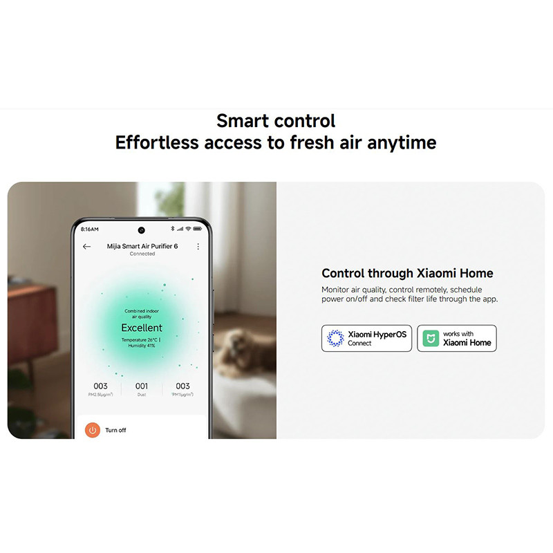 امروزه خرید دستگاه تصفیه هوا برای پاک سازی بسیاری از اماکن در شهرهای بزرگ که با مشکل آلودگی هوا دست و پنجه نرم میکنند، مانند خانه و محل کار یک خرید فوق العاده حیاتی محسوب میشود. کمپانی میجیا که همواره محصولات با کیفیت و مقرون به صرفه تولید می کند، به تازگی محصولی جهت سلامت کاربران، تحت عنوان دستگاه تصفیه کننده هوای میجیا مدل Smart Air Purifier 6 را طراحی، تولید و به بازار عرضه کرده است. این دستگاه با قابلیت تصفیه ذرات بزرگ، گرد و خاک، بوهای نامطبوع و .. می تواند هوای محیط را پاک و تازه نگه دارد، که با توجه به نوع طراحی و قابلیت های متنوعی که دارد قابل استفاده در محل کار و یا منزل است. این دستگاه با حجم هوای خروجی ۴۴۳ متر مکعب در ساعت، قادر به تصفیه ی حجم زیادی از هوا در کوتاه ترین زمان ممکن است؛ این حجم بالای هوای خروجی باعث می شود که آلودگی ها و ذرات معلق در هوا به سرعت حذف شوند تا شما بتوانید در فضایی با هوای پاک و سالم تنفس کنید. این محصول در ابعاد و وزن بسیار مناسبی طراحی شده است که آن را به یک گزینه کم جا و مناسب برای انواع فضاهای کوچک و بزرگ تبدیل نموده و امکان قرارگیری در هر گوشهای از خانه یا دفتر کار را برای کاربران فراهم میکند، که در کنار زیبایی، سلامت هوای محیط شما را نیز تضمین می نماید. لازم به ذکر است که توان دستگاه تصفیه کننده هوا مدل AC-M25-SC توان 40 وات است که با توجه به عملکرد قوی آن، این میزان مصرف برق بسیار بهینه به نظر می رسد. این دستگاه دارای پنج سنسور دقیق (PM1 sensor ،Temperature sensor، Humidity sensor، Dust sensor و PM2.5 sensor)، فیلتر پنجلایه با نور UVC، پشتیبانی از فرمانهای صوتی Google Assistant و Amazon Alexa است که نیاز مخاطب در هر زمینه ای را به خوبی پوشش می دهد. نمایشگر رنگی دستگاه، اطلاعات کاملی از وضعیت و کیفیت فعلی هوا را نمایش میدهد و به این ترتیب همیشه می دانید در چه شرایطی تنفس می کنید. یکی از جذابترین ویژگیهای این تصفیههوا، قابلیت کنترل از راه دور از طریق اپلیکیشن Xiaomi Home است. کاربران میتوانند به راحتی کیفیت هوای خانه را بررسی کرده، دستگاه را روشن یا خاموش کنند، زمانبندی تنظیم نمایند یا وضعیت فیلتر را چک نمایند.