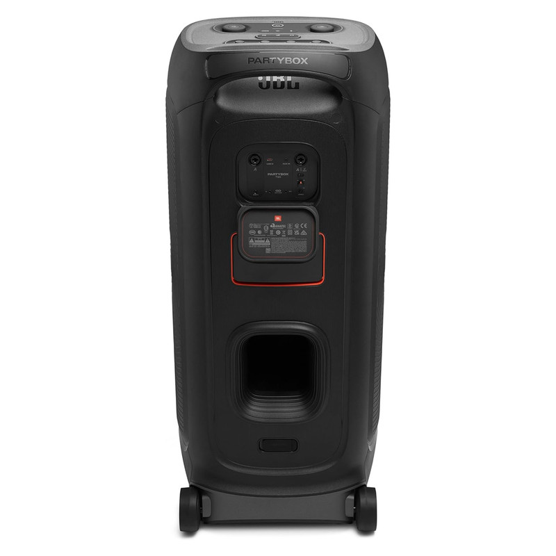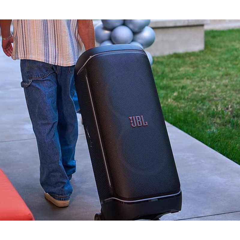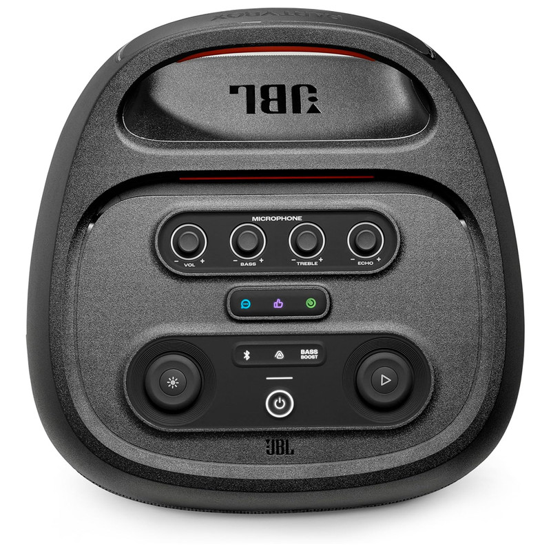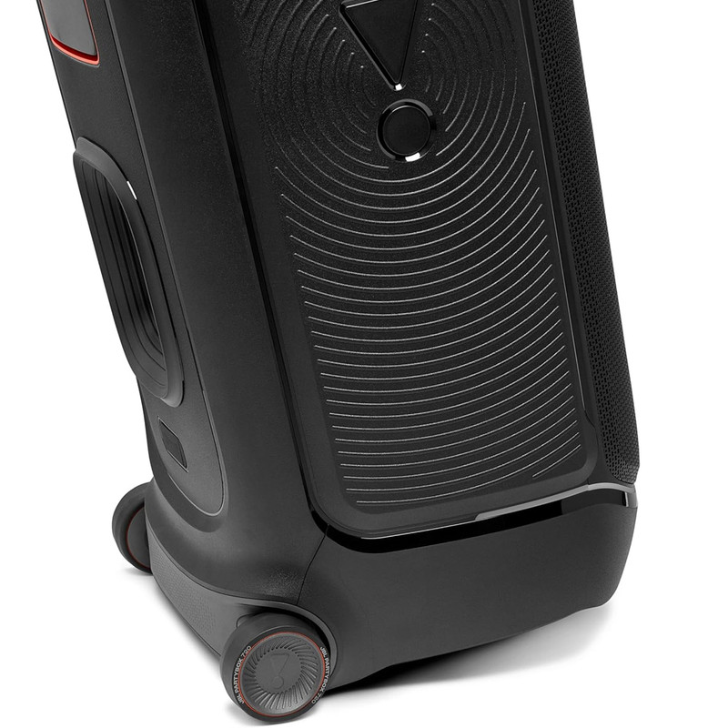 (این اسپیکر بدون باتری بهفروش میرسد) - اسپیکر بلوتوثی قابل حمل جی بی ال مدل PartyBox 720، یک غول صوتی ۳۱ کیلوگرمی با ابعاد ۴۰۶x۹۴۲x۴۱۶ میلیمتر است که با بدنهای از جنس پلاستیک و چرخ و دستگیره ثابت طراحی شده تا جابهجایی آن آسان باشد، این دستگاه قدرتمند با توان خروجی کلی ۸۰۰ وات، صدای JBL Pro Sound را از طریق دو سابووفر ۹ اینچی و دو توییتر ارائه میدهد و پاسخ فرکانسی گستردهای بین ۳۲ تا ۲۰۰۰۰ هرتز دارد، همچنین با بهرهگیری از فناوری AI Sound Boost کیفیت خروجی صدا را بهینه میسازد و به واسطه گواهی مقاومت در برابر پاشش آب و گرد و غبار، برای فضاهای باز نیز مناسب است، نورپردازی دینامیک و هماهنگ با ریتم موسیقی (نور RGB) یکی از ویژگیهای برجسته این اسپیکر است که از طریق اپلیکیشن JBL PartyBox قابل تنظیم است، اتصالات آن بسیار کامل است و شامل بلوتوث نسخه ۵.۴ با پروفایلهای A۲DP و AVRCP، ورودیهای AUX، USB Type-C، دو ورودی XLR برای اتصال میکروفون یا گیتار الکتریک و قابلیت Auracast برای اتصال چندین اسپیکر میشود. علاوه بر آن، دکمه Bass Boost و قابلیتهای تنظیم اکولایزر و حالتهای مختلف پخش صدا برای شخصیسازی تجربه شنیداری در آن تعبیه شده است.