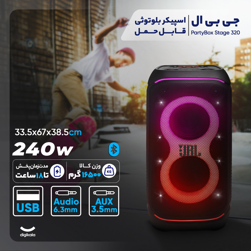 شرکت JBL همواره در زمینهی تولید تجهیزات صوتی پیشگام بوده است. پارتی باکس JBL با صدای قدرتمند و باکیفیت، توجه را به خود جلب میکند و این بار با Stage 320 توانسته تمام نیازهای شما را برای داشتن تجربه شنیداری متفاوت برآورده کند. در نمایشگاه CES 2024، جی بی ال مجموعه جدیدی از اسپیکرهای PartyBox خود را معرفی کرد که شامل اسپیکر JBL PartyBox Club 120 و اسپیکر JBL PartyBox Stage 320 میباشد. صدای ارائه شده توسط اسپیکر جی بی ال Stage 320 نمونهای برجسته از کیفیت بالای صوتی است با دو ووفر با حساسیت بالا و دو توییتر صدایی دقیق و واضح را حتی در فضای باز ارائه میدهد. استفاده از فناوری AI Sound Boost، صدایی قدرتمند و با اعوجاج کمتر را تضمین میکند. این فناوری با بهرهگیری از الگوریتمهای هوش مصنوعی، صدا را در زمان واقعی تحلیل کرده و بهینهسازی میکند، تا تجربهی شنیداری باکیفیتی را برای شنوندگان فراهم آورد. اسپیکر JBL PartyBox Stage 320 متناسب با نیازهای مهمانیهای مدرن و جابجایی آسان طراحی شده است. این محصول با اندازهای مناسب و دسته تلسکوپی و چرخهای محکم خود، حمل و نقل راحتی را فراهم میکند. انرژی لازم برای اسپیکر JBL PartyBox Stage 320 از طریق یک باتری لیتیوم یونی با ظرفیت 9444 میلیآمپر ساعت ( 68wh) تأمین میشود و زمان پخش موسیقی این اسپیکر 18 ساعت برآورد شده است. این اسپیکر از قابلیت فستشارژ نیز بهره برده است؛ به این ترتیب با 10 دقیقه قرارگرفتن در شارژ، میتواند تا 2 ساعت موسیقی پخش کند. برای شارژ شدن کامل آن نیز حدود 3 ساعت زمان نیاز است.
